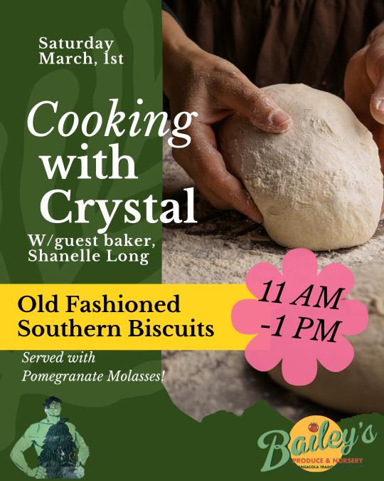 This Saturday, March 1st, from 11 AM to 1 PM, come join us at Bailey’s Farmers Market & Produce for a FREE sample of homemade, old-fashioned Southern biscuits that will melt in your mouth!